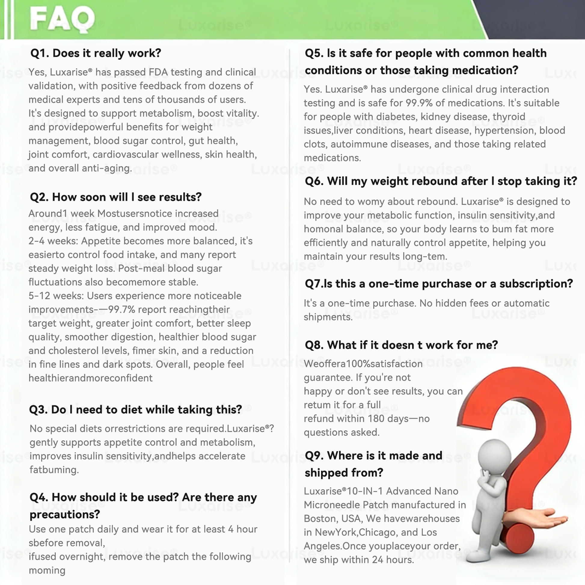 Developed with input from metabolic and endocrinology research, Luxariseยฎ Moringa & Berberine 10-IN-1 Advanced Nano Microneedle Patch delivers measurable improvements in appetite control, energy levels, digestive comfort, and body composition. Many users report noticeable changes within their first 7 days of consistent use.